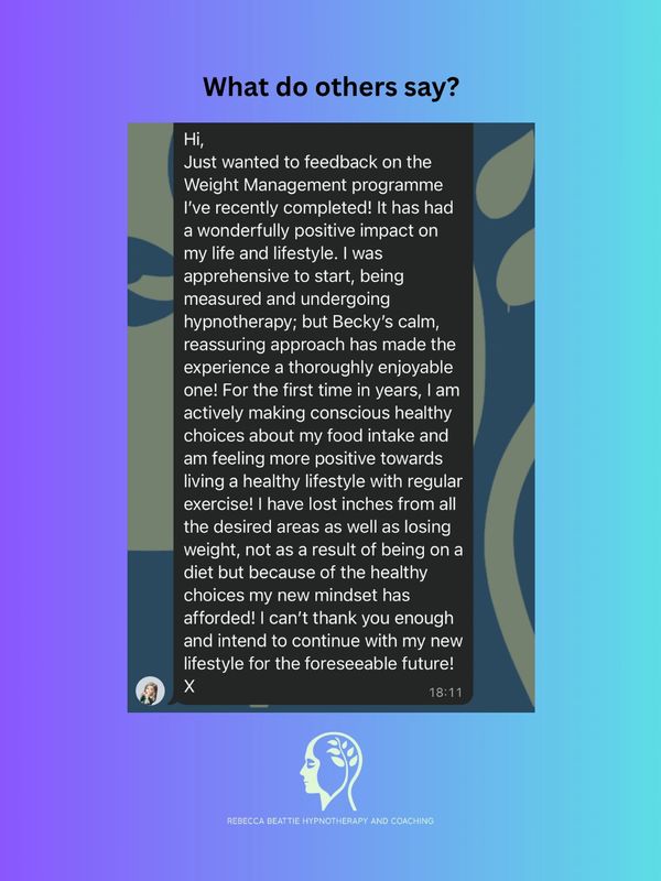 This is a client that I have been working with for a few months. She came to me because she was struggling to eat and was losing weight quickly. She had struggled to find the right help to get to the bottom of why she was struggling and through hypnotherapy, coaching and EFT she is now eating more and enjoying her food. She has put on weight and it is amazing to see how much happier and more confident she is.